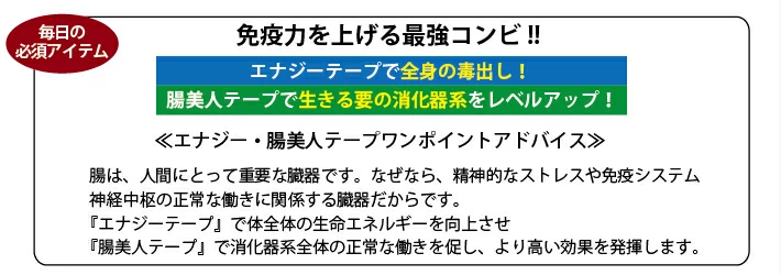 favorite_border 腸美人テープ ¥1,100 (税込) 関連カテゴリ テープ テープ 腸美人テープ 数量 カートに入れる close カートに追加しました。 カートへ進む お買い物を続ける 消化器系(口→食道→胃→腸→肛門)に働きかける事で、代謝を促進し、免疫力を向上させます。エナジーテープと同時使用することでより高い効果を発揮します。 <消化器系> <期待できる効果> 代謝促進・血液サラサラ・筋肉低下防止 若返り・治癒力、免疫力が上がる・胃腸が原因の肌荒れ防止 <使い方> 貼付位置(みぞおち)→へその上で、胸の骨(胸骨)の下のくぼんだ所。 貼付時間→1時間半/1日 ※テープは25mm角に切って使用して下さい。 ※1日700ml以上の水を摂取すると、シールの効果がよりアップします。 <ワンポイントアドバイス> サイズ幅25mm×長さ10m 素材綿・ポリウレタン・アクリル系糊・紙 製造国日本 注意事項・鉱石アレルギーの方はご使用をお避け下さい。 ・アレルギー体質の方や、肌が敏感な状態にある場合は、ご使用をお控え下さい。 ・お肌を清潔にし、よく乾かしてからご使用下さい。 ・キズぐちには直接貼らないで下さい。 ・強く引っ張って巻いたり、しめつけすぎると血行障害をおこす事がありますので、 やわらかく巻いて下さい。 ・皮膚かぶれ・かゆみの原因となりますので、伸ばし過ぎにより皮膚を過度に引っ張った状態で貼付しないで下さい。 ・同じ部位に繰り返し貼る場合は、テープを貼る位置をずらして下さい。 ・粘着剤を使用していますので、はがす時に痛みを伴う場合があります。 ・使用後は、皮膚障害を起こす場合がありますので、はがす所の皮膚部分を指で押さえながら、皮膚を傷めないよう体毛の流れに沿ってゆっくりはがして下さい。 ・長時間貼付したり、急激にはがさないで下さい。 ・小児の手の届かないところに保管して下さい。 ・高温・多湿・直射日光のあたる場所を避けて保管して下さい。 ・商品の効果には個人差があります。