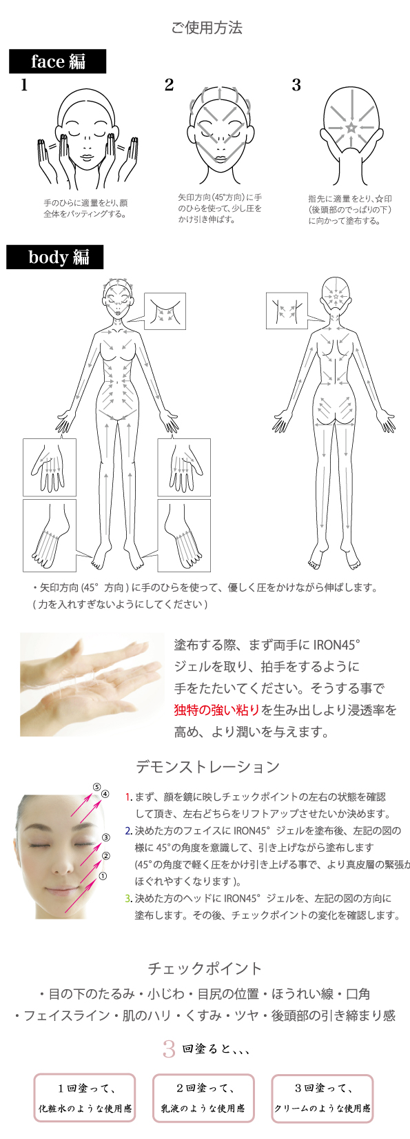 favorite_border IRON45°ジェル 通常価格 ¥9,900 ~ ¥16,500 (税込) ¥9,900 ~ ¥16,500 (税込) 関連カテゴリ IRON45° IRON45° ジェル 選択してください500ml200ml 数量 カートに入れる close カートに追加しました。 カートへ進む お買い物を続ける 1.肌に吸い付くような独特の粘りで肌のきめを整え美しい肌を手に入れます。 2.肌に素早く浸透し、真皮層の緊張がほぐれる事で自律神経を整え、肌細胞を活性化する事ができます。 3.皮下組織に水分を蓄えた状態に出来ることで、疲労物質や毒素が溜まりにくく、美と健康に関する様々な問題を解決します。 期待できる効果 リフトアップ、ハリ、ツヤ、シミ、美白、保湿 くすみ、小じわ、毛穴の引き締め、新陳代謝促進 こんな悩みの方にも ニキビ、吹き出物、アトピー、乾燥肌、敏感肌、オイリー肌 むくみ、ゆがみ、抜け毛、神経痛、筋肉痛、内臓機能の低下、アレルギー センキュウ・サイシンの独特の香り 小腸の働きが上がり、全身の免疫機能UP 解毒・代謝を促進します。 <5種類のオリジナルブレンド植物エキス配合> オクラ果実エキス/保湿/ヒアルロン酸産生促進 ヒバマタ(褐藻)エキス/保湿、血行促進/皮膚の保護 クズ根(カッコン)エキス/保湿、血行促進/抗炎症作用、美白(メラニン生成抑制) センキュウ根茎エキス ウスバサイシン根茎/根エキス 配合成分水・BG・グリセリン・イソペンチルジオール・オクラエキス・カッコンエキス・褐藻エキス・カルボマー・ポリアクリル酸Na・アルギン酸Na・メチルパラベン・水酸化Na 製造国日本 注意事項【IRON45°リップクリーム】 ※お肌に異常が発生していないかよく注意して使用してください。 ※唇に合わない場合は、ご使用をおやめください。 ※使用中、赤み、はれ、かゆみ、刺激、色抜け(白班等)や黒ずみ等の異常が生じた場合、使用した肌に直射日光が当たって異常が生じた場合、そのまま使用を続けますと症状を悪化させることがありますのですぐに使用を中止し、皮膚科専門医等にご相談されるとことをおすすめします。 ※目に入らないように注意し、入ったときはすぐに洗い流してください。 ※直射日光の当たる場所や高温多湿を避け、幼児の手の届かないところに保管して下さい。