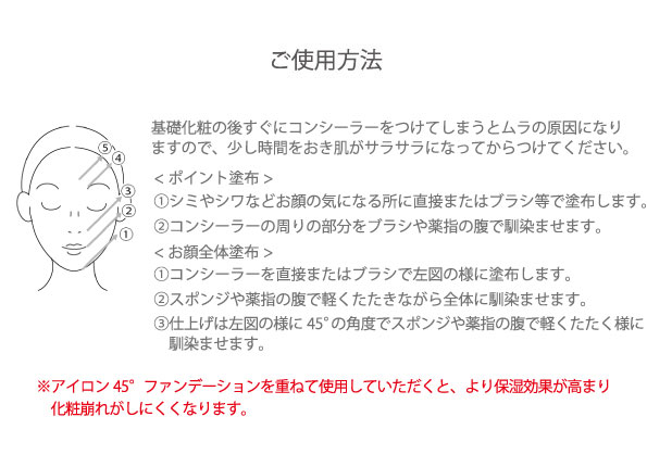favorite_border IRON45°コンシーラー 通常価格 ¥6,600 (税込) ¥6,600 (税込) 関連カテゴリ IRON45° IRON45° コンシーラー 選択してくださいコンシーラーライトコンシーラー 数量 カートに入れる close カートに追加しました。 カートへ進む お買い物を続ける 1.シミを薄くする オリジナルブレンドの植物エキスの効果で、真皮層の緊張を和らげ皮下組織に水分を蓄えた状態にすることでメラニン色素が留まりにくくなり、シミの改善や予防の効果があります。また、シミ以外にもシワ、たるみ、赤み、目の下のくま、ほうれい線にも効果があります。 2.皮膚呼吸を妨げない オリジナルブレンドの植物エキスの効果と、肌に害の少ない材料を厳選する事で、12時間皮膚呼吸を妨げません。長時間使用しても肌への負担が少なく肌の保湿力が高まり、抜群のリフトアップ効果と乾燥によるあぶら浮きや化粧崩れを防ぎます。 3.血液、リンパ促進 オリジナルブレンドの植物エキスの効果で、塗布した部分の血液リンパの流れを促進させます。下地やファンデーションとして使用するとお肌のキメを整えることが出来ます。 期待できる効果 シミ、シワ、たるみ、くすみ、赤み、目の下のくま、ほうれい線 Q. 皮膚呼吸が妨げられるとどうなるか? 肌が乾燥してしわ・たるみ・くすみ・シミ・オイリー肌等の肌トラブルの原因になります <4種類のオリジナルブレンド植物エキス配合> オクラ果実エキス/保湿/ヒアルロン酸産生促進 ヒバマタ(褐藻)エキス/保湿、血行促進/皮膚の保護 クズ根(カッコン)エキス/保湿、血行促進/抗炎症作用、美白(メラニン生成抑制) ハマメリス葉エキス/収斂作用/(皮膚を引締め整える)/抗炎症作用 4種類の植物エキスをオリジナルブレンドする事で、皮膚呼吸の妨げによる肌への負担が軽減します。お顔全体に塗布すると、肌への保湿力が高まり、抜群のリフトアップ効果と乾燥によるあぶら浮き・化粧崩れを防ぎます。